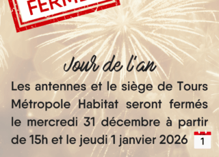Les antennes et le siège de Tours Métropole Habitat seront fermés le mercredi 31 décembre à partir de 15h00 et le jeudi 1 janvier...