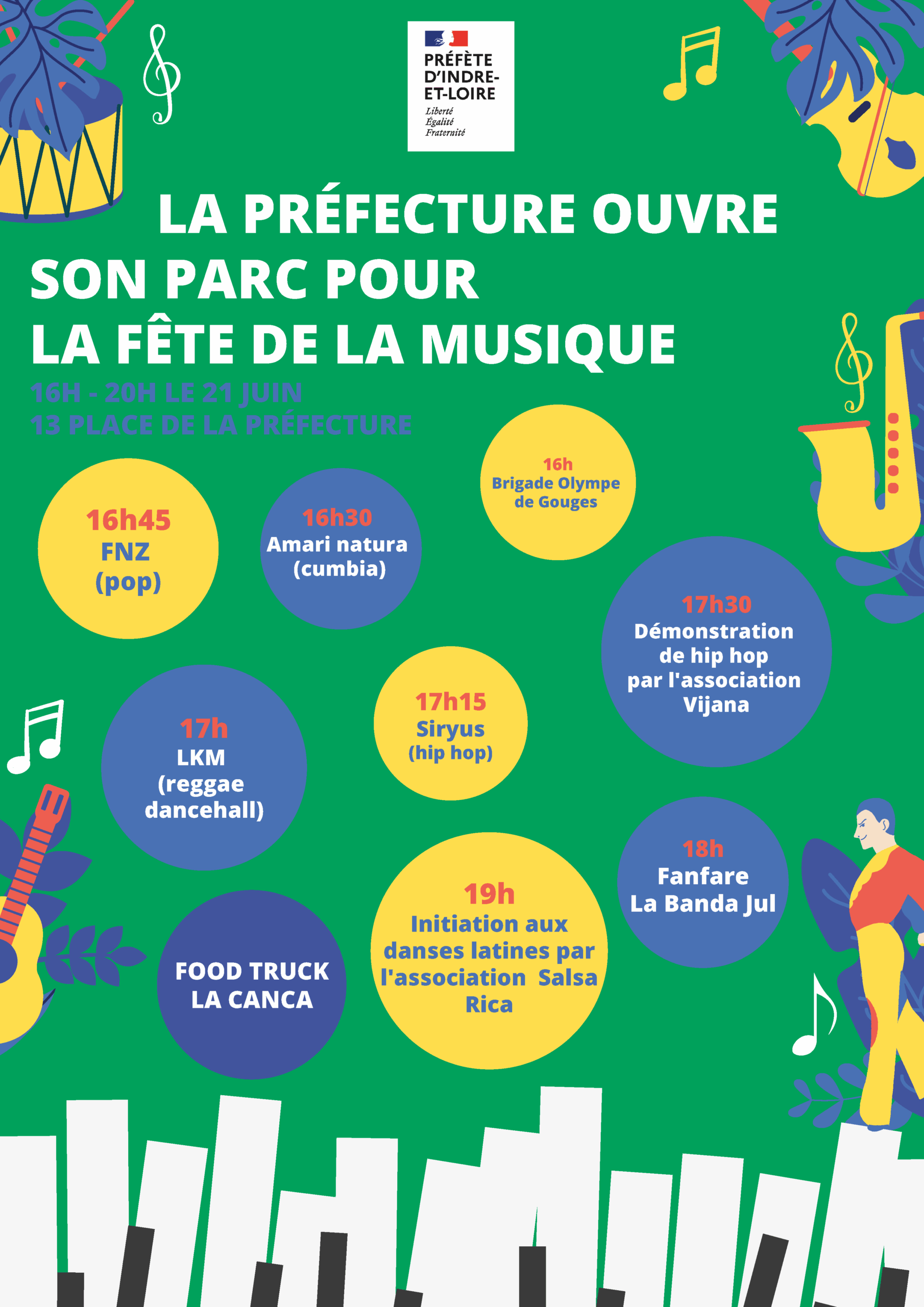 21 juin : Fête de la musique à Tours Venez profitez de la fête de la musique au parc de la préfecture à Tours, Musique et animations à partir de 16h.